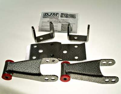 Manufactured by DJM Suspension | FK3098-3 | 1998-07 Ranger 3 inch Rear Drop Kit, Flip brackets and raising shackles, Priced As Each - Medium Install - Instructions - Yes, The first thing to get off the table regarding “flip kits” is nothing is actually flipped! Simply put a flip kit moves the axle from beneath the leaf spring to on top of the leaf spring. When you place your axle on top of the leaf springs there are two very important things to consider. No. 1 you must move the rear axle back towards the rear of the truck, away from the transmission, around ¾ of an inch. This is done because your drive shaft actually becomes longer when you “flip” your axle. You’ll notice the splined slip joint in the front of your drive shaft. It’s there to allow the drive shaft to move towards and away from the transmission as the suspension cycles up and down. If you were to support your truck by placing jack stands under the frame (both sides) in the rear. Then, with a floor jack supporting the rear end, remove the lower shock bolts and let the rear end down with the floor jack and look at the splined slip joint, you will see a fully extended slip joint. Now slowly jack the rear end up with the floor jack and watch the slip joint contract. If you could jack the rear end up to the point where it was level with the transmission the splines might completely disappear and the drive shaft would be forced into the transmission. This is not a good thing and why you need to move the axle back away from the transmission when you install a “flip kit”. The axle locator brackets accomplish this, generally a “U” shaped piece that sets on the leaf spring, over the center bolt. There is a hole in the factory axle locator which is centered, and you will see that the hole in the axle locator from the flip kit is offset. That is how the flip kit moves the axle back away from the transmission. It is very important to make sure you install the axle locator bracket correctly with the offset hole over the leaf spring center bolt spacing the axle to the rear. Now the second consideration when installing a “flip kit” is pinion angle. The typical drop you can expect from a flip kit is in the 5” to 8” range, depending on the thickness of your leaf spring pack. And while the rear of a pick up truck is designed to operate in a wide range of ride heights (empty to overloaded) it is still necessary to establish an optimal static pinion angle. Axle locating brackets in most flip kits have a built in angle, by having unequal length legs in the “U”. This works pretty good most of the time, but not all trucks are created equal and often you need to adjust the pinion to get rid of a pesky vibration. You can buy pinion “shim kits” that come in 2, 4, and 6 degree packages that need to be installed between your axle locator bracket and the leaf spring. Better that that, DJM makes their flip kits with adjustable axle locator brackets. You have the ability to rotate your axle to the proper angle and then lock it in place. This is the best way to deal with pinion angle. Oh, one more thing about vibrations, if you have a two piece drive shaft and you’re having very low speed vibrations it is almost always caused by the carrier bearing. The bearing where the short front drive shaft and the longer back drive shaft connect. Typically raising this “carrier bearing” up towards the bottom of the bed between ½” to 1” will rid you of this inconvenience. There are kits available for this condition also. Product information updated on 2025-07-28. This product can ship by Small Parcel
