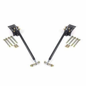 Front HQ Series Coil-Overs allow for a 1″-3″ lowered stance (2″ optimal) and are a direct replacement for factory shock and spring. They utilize an impact forged aluminum body and Monotube design to deliver excellent ride quality and handling. They allow fine tuning of the ride quality and handling via the rebound adjustment knob with 24 positions of adjustment. Premium Hyperco springs are used that are CNC cold wound with high tensile steel. Upper StrongArms correct the camber and ball joint angles to allow proper wheel alignment. They are fully assembled with ball joints and bushings and are power coated satin black. Rear HQ Series Shocks are also rebound adjustable and include brackets to correct the shock angle at the lowered stance more maximum effectiveness.The Rear 4″ Lowering Kit for the rear includes axle flip brackets, stout front leaf spring hangers and adjustable shackles to fine tune the stance.Optional Traction Bars eliminate nearly all wheel hop with a unique design that still allows for full load capacity and smooth compliant ride.Optional Helper Bags provide extra load capacity.Optional Rear Sway Bar for improved cornering